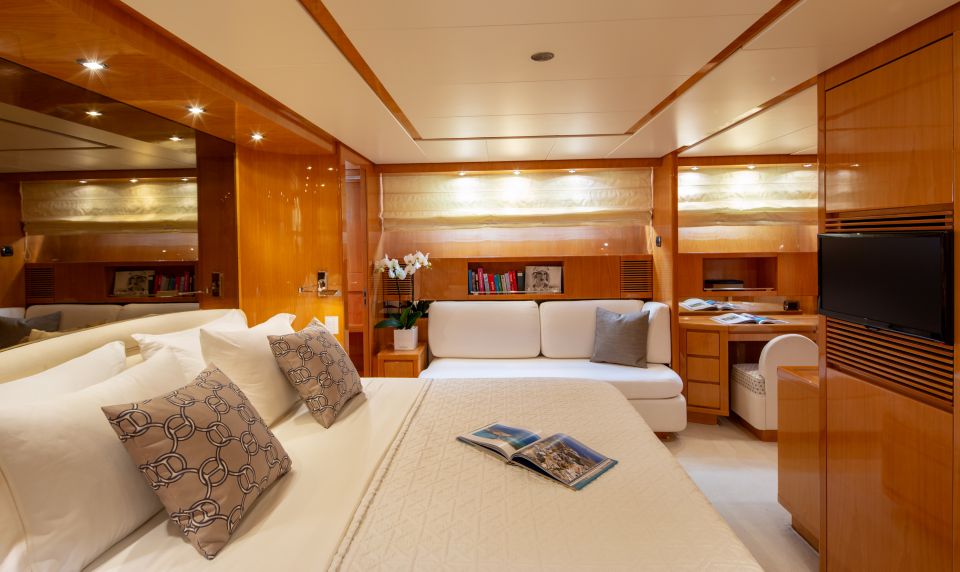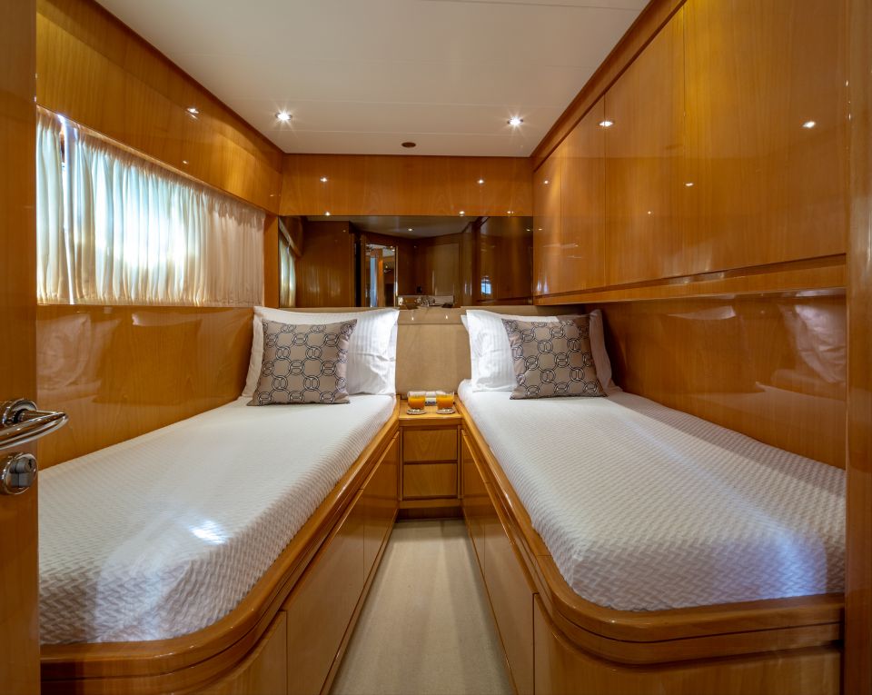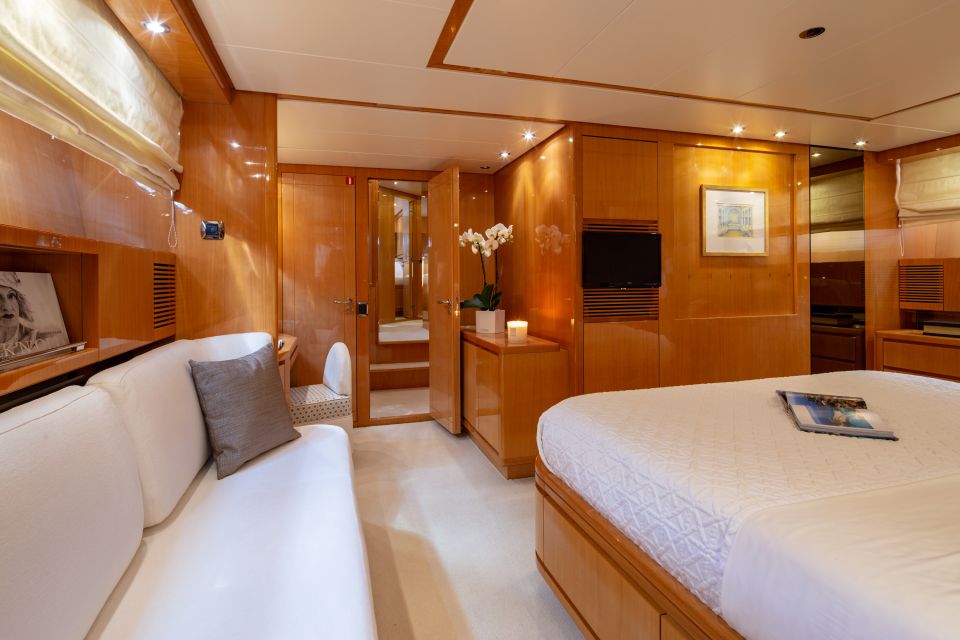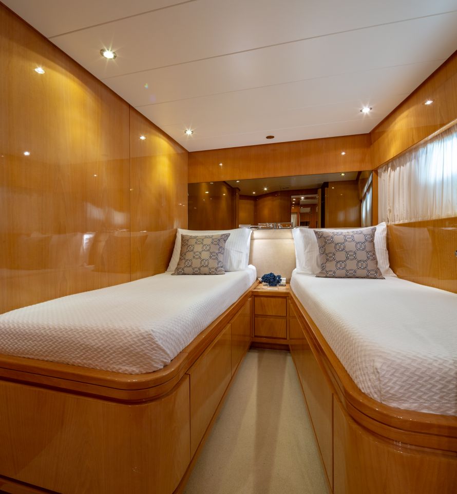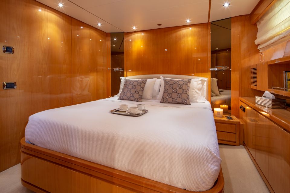 Featuring accommodation for 8 guests in 4 cabins with warm woods. She is a great example of quality and style, well equipped with all the amenities and with air conditioning throughout. She offers a multitude of living configurations, including the staterooms with an on-Deck Guest cabin forward the main deck, equipped with queen size bed and en-suite bathroom and shower.